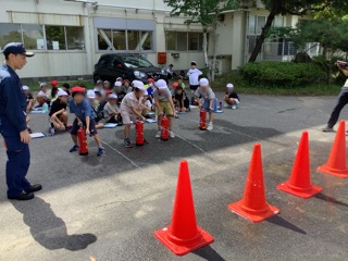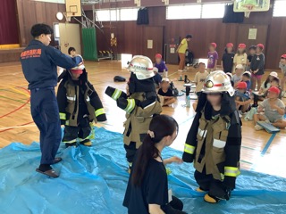 新潟西消防署の署員の方をお招きしてリトルファイヤースクールを行いました。「消防の仕事」のお話を聞いたり、消火器体験、けむり体験をしたりしました。けむり体験では、実際の火事になったときのけむりの怖さを実感していました。また、消防服を実際に着てみて、その重さに驚き、消防士の方々の苦労を知ることもできました。