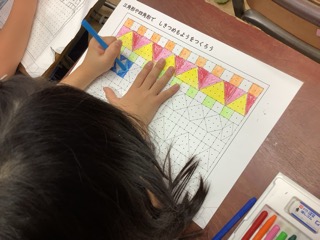 「三角形と四角形」の学習のまとめとして、三角形と四角形を使った「しきつめもよう」作りに挑戦しました。点と点を結んでいろいろな三角形と四角形を作っていきます。できた図形に色を塗って完成です。子どもらしい、ステキな幾何学模様ができました。