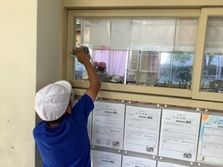 前期も終わりが近づいてきたので、教室や廊下の大清掃を行っています。すす払いでエアコンについたほこりを落としたり、新聞紙を使って窓ガラスを拭いたりして、隅々まで清掃しています。なかよし班で力をあわせてがんばっています。