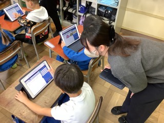 週に1回、タブレットの使い方を教えていただいたり、タブレットの設定をしていただいたりするためにICT支援員さんが来校されます。今日は、1年生がドリルパークの使い方を教えていただきました。専門的な知識を生かして、分かりやすく、丁寧に指導していただきました。ICT支援員さんには、職員研修でもお世話になっています。ありがとうございます。