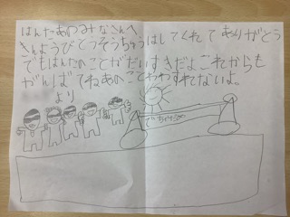 今日の休み時間に、1年生の子どもたち3人が校長室にやってきて、「校長先生、これ、ハンターさんに渡して!」と、手紙を持ってきました。先週金曜日に行われたPTA主催の「逃走中」でがんばってくださったハンターへの感謝の手紙です。あまりにも楽しかったので、感謝の気持ちを伝えようと自分たちから手紙を書いたようです。感謝の気持ちを素直に伝えられる1年生に、心が和みました。子どもたちの心に残る行事を企画してくださり、ありがとうございました。