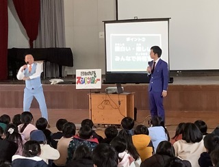 PTA会長の大野さんがコンビを組んでいるジャックポットさんをお招きして、3年生のPTA行事「お笑い授業」を行いました。「つまらないをおもしろく!おもしろいをもっとおもしろく!」をテーマに、学校生活を楽しくするためのポイントを教えていただきました。ポイント一つ目 は、「よく見る よく聞くこと」、ポイントの二つ目「おもしろいこと 楽しいことを みんなで共有すること」だそうです。「普段見落としがちな小さなことや小さな変化に目を向けることで、楽しいことがたくさん見つかること」「見つけた楽しさをみんなと共有すると、もっと楽しくなること」を教えていただきました。たくさんの笑いに包まれて、親子で楽しいひとときを過ごすことができました。