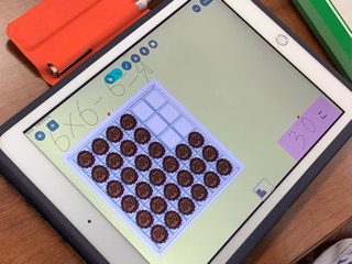 箱の中に残っているチョコレートの数を九九を使って求める問題に挑戦しました。「6個のグループが5つできるから、6×5=30 30個」「右端の3個を上に移動して、6×5=30 30個」「全部入っていたら6×6=36、6個ないから36−6=30 30個」など、いろいろな方法が出されていました。どの子も九九を上手に使って課題を解決していました。