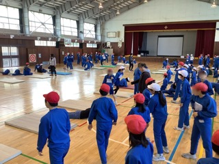 マット運動に取り組んでいます。前転、後転、開脚前転、開脚後転などに挑戦します。スムーズに回転するのは難しいようですが、手をつく位置や脚を開くタイミングなどに気をつけて繰り返し練習していました。