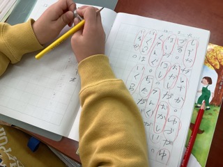 「さかさことば(回文)」や、「だじゃれ」「わたしはだあれ」など、言葉遊びを楽しみました。「せみのみせ」「ねこがねころぶ」など、思い思いに文を作りました。「わたしはだあれ」では、例えば、こまを表す文として、「(こ)ろころ (ま)わる」のような文を作って楽しみました。子どもらしい、かわいらしい文がいっぱいできました。どんな文を作ったか、お子さんに聞いてみてください。
