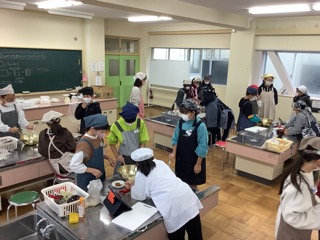 みそ汁作りに挑戦しました。具材は、ジャガイモ、ネギ、油揚げです。煮干しから丁寧に出汁をとりました。初めてみそ汁を作った児童も多かったようですが、手順を考え、協力して調理していました。家庭科室が、煮干しのいい香りで満ちていました。