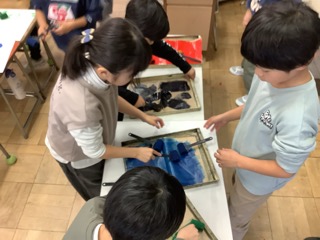 紙版画に取り組んでいます。クジラや車、くだものなど、自分の好きなものを紙で切り抜き、型紙を作ります。スポンジやローラーで型紙の周りにインクを塗り、型をうつしとります。型紙を置く場所や重なり、色などを工夫して、一生懸命に作品作りに取り組んでいました。