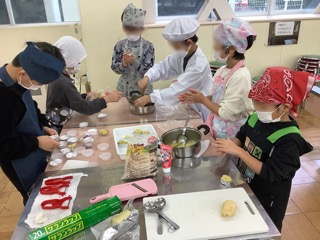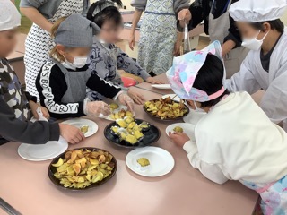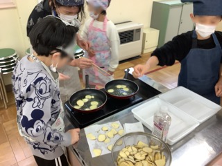 たんぽぽ2、3組の子どもたちが、栽培して収穫したさつまいもを使って、さつまいもチップスとスイートポテト作りに挑戦しました。皮を剥いたり、硬い芋を切るのは大変でしたが、頑張って調理しました。少し怖がりながら、薄く切ったさつまいもを油の中に入れていました。また、とても上手にスイートポテトの型を整えていました。できあがったものをみんなでいただきました。どちらもとてもおいしかったです。