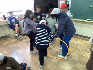 5年生が楽しいゲームを考えてくれました。フルーツバスケットや爆弾ゲームを楽しみました。紙で作ったレールをつなげて、ビー玉を転がし、瓶の中に入れる「パイプライン」や、繋いだ手を離さずにフラフープを送っていく「フラフープ送り」など、新しいゲームに挑戦している班もありました。