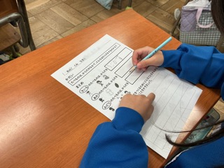 食べ物は、赤、黄、緑の種類に分けられ、赤は「からだをつくるはたらき」、黄色は「からだをうごかすはたらき」、緑は「からだをまもるはたらき」があることを学びました。そして、給食には、3つの食材がバランスよく含まれていることを確認し、健康で丈夫な体をつくるために、これから頑張っていきたいことを考えました。「嫌いな物も残さず食べるようにがんばる!」「三色の食べ物をバランスよく食べたい」など、それぞれのめあてを立てていました。