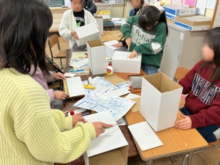 ダンボールの箱に、切れ込みを入れて扉を作ったり、引き出しをつけたりして、ダンボールを使ったオリジナルボックスを制作しています。「お気に入りのぬいぐるみを入れたい」「文房具を入れようかな」「ゲームのソフトやカードをしまえるように、工夫しよう」など、出来上がりを想像しながら、楽しく作業していました。