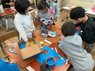 大切なものをしまう箱作りに取り組んでいます。色画用紙や折り紙を貼ったり、毛糸やリボンをつけたりして、飾り付けをしています。仕切りをつけて、整理しやすように工夫している子もいました。「シールを入れるよ」「ぬいぐるのお部屋にするよ」「ペットを入れたいけど、ちょっとムリかなぁ」など、楽しくお話しながら、作業していました。後片付けの時間になっても、なかなかやめられず、夢中になっていました。