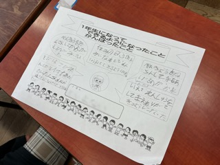 1年生になってできるようになったこと、がんばったことを発表し合いました。「はやく走れるようになったよ」「きらいなものも一口食べるようにがんばったよ」「自分から声をかけて友達がふえたよ」「なわとびがとべるようになったよ」など、1年間の自分の成長をたくさん出し合いました。今後は、できるようになったこと、がんばったことをお家の方々に知らせる発表会の準備を進めていきます。