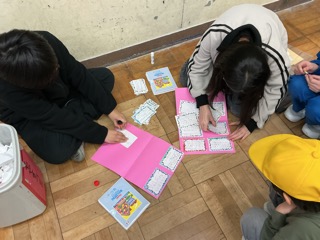6年生を送る会で6年生に贈るメッセージカードを作りました。1〜5年生が書いたメッセージを持ち寄り、色画用紙に貼り付けてカードを完成させます。「一緒に遊んでくれてありがとう」「なかよし遠足のとき、リュックを持ってくれてうれしかったです」など、一人一人にむけた温かいメッセージがたくさん書かれていました。2月17日の本番に向けて準備が着々と進んでいます。