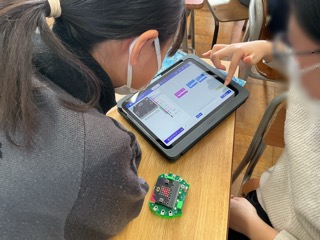 電気を効率よく使うために、電化製品などはプログラミングによって、制御されています。その一端を学習するために「マイクロビット」と呼ばれる教材を使って、プログラミングに挑戦しました。マイクロビットは、タブレット上でブロックを繋げて作ったプログラムを転送すること、文字を表示したり、音を出したりすることができます。初めてプログラミングに挑戦する子どもも多かったのですが、すぐに慣れて自分の名前を表示したり、音楽を作って流したりしてプログラミングを楽しんでいました。