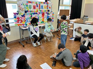 たんぽぽ学級が「卒業・進級おめでとう会」を開きました。思い出ビンゴをしたり、スライドショーを観賞したりして楽しみました。スライドショーがとても楽しかったようで、「もう1回見たい!」と声があがっていました。在校生からプレゼントをもらった卒業生は、少し照れながら「ありがとうございます。これからもがんばってください」とメッセージを伝えていました。楽しい時間を過ごすことができました。