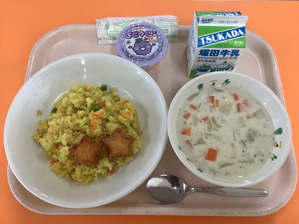 ・カレーピラフ ・ポンポンのお夜食チャウダー ・スター⭐️ポテト ・ぶどうゼリー ・牛乳 お話給食3回目は、「パンダのポンポン 夜空のスターチャウダー」の本です。 パンダのポンポンは、街で …