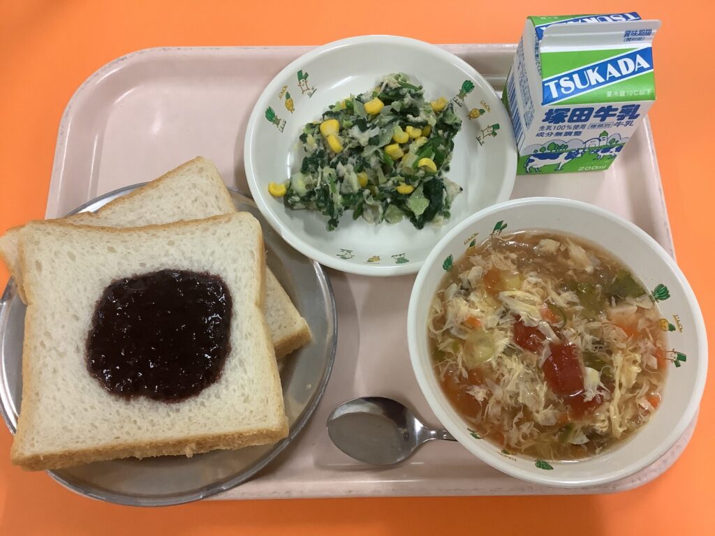 ・ジャイアントジャムサンド(食パン 手作りいちごジャムバター) ・トマトと卵のスープ ・チキンとほうれん草のサラダ ・牛乳 お話給食6回目は「ジャイアントジャムサンド」を紹介します。 …