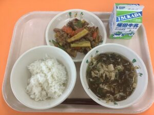 ・ごはん ・たまごともずくのスープ ・豚肉と根菜の黒酢炒め ・牛乳