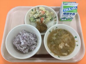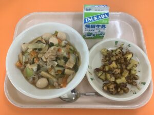 ・ごはん ・中華丼の具 ・大豆とさつまいもの揚げ煮 ・牛乳