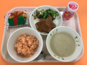 ・パプリカライス ・冬野菜の豆乳ポタージュ ・星型ハンバーグのフォレスティエール風ソース ・もみの木サラダ ・クリスマスショコラケーキ ・ジョア(いちご)