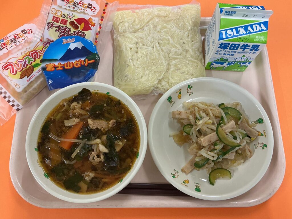 ・ゆで中華麺 ・みそスープ ・鶏ハムときゅうりの中華風サラダ ・セレクトデザート(チョコクレープ・さつまいもと栗のタルト・富士山ゼリー) 給食週間2日目は子どもたちがとても楽しみにしていたセ …
