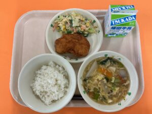 ・ごはん ・卵と冬野菜のとろみスープ ・チキンタレカツ ・キャベツと冬菜のごまネーズサラダ ・牛乳