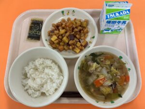 ・ごはん ・海苔の佃煮 ・肉団子と白菜のスープ ・大豆とさつまいもの揚げ煮 ・牛乳