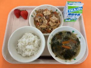 ・ごはん ・ホタテ入りわかめスープ ・厚揚げと豚肉の味噌炒め ・いちご ・牛乳