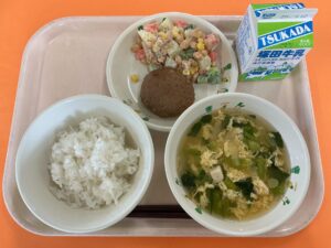・ごはん ・かきたまみそ汁 ・煮込みハンバーグ ・ビーンズサラダ ・牛乳