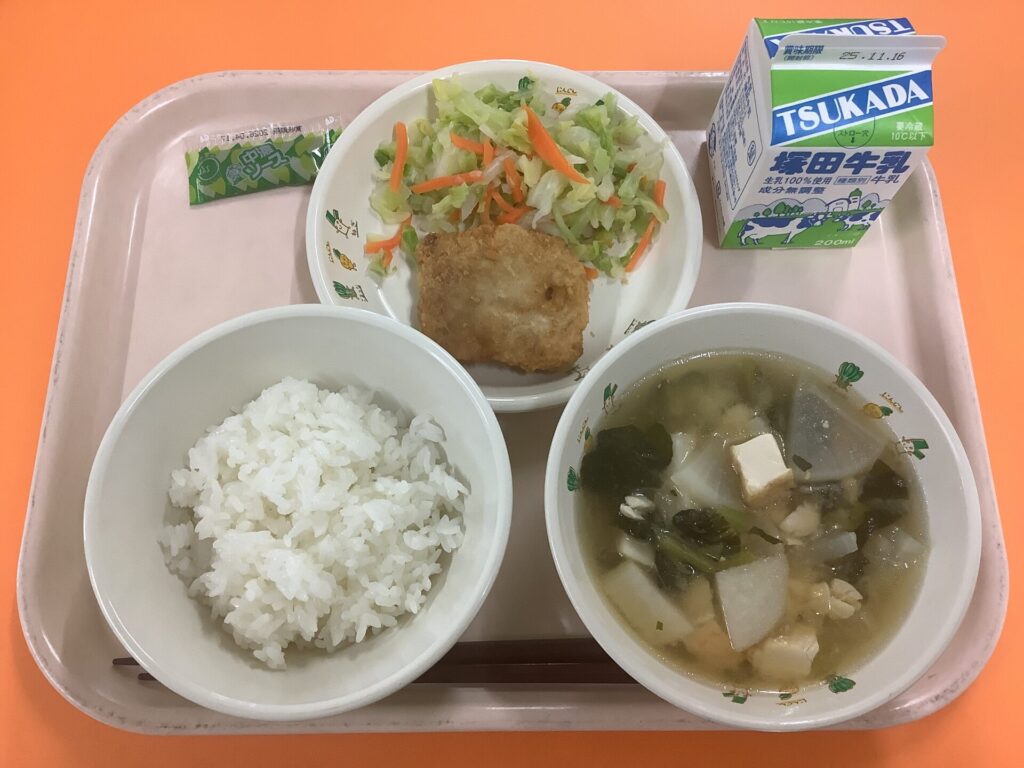 ・ごはん ・大根と生揚げのみそ汁 ・とんかつ ・小袋ソース ・塩もみキャベツ ・牛乳 11月10日(月)〜21日(金)は読書旬間です。 給食でも本の世界を楽しみながら美味しく食べてもらえるよ …