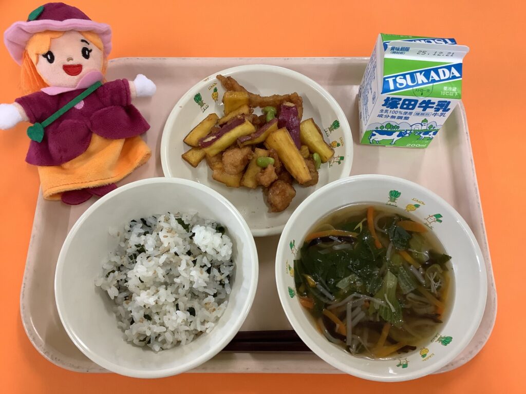・わかめごはん ・ほたてとチンゲンサイのスープ ・鶏肉といもジェンヌの黒酢がらめ ・牛乳