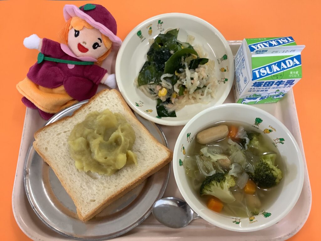 ・食パン ・いもジェンヌのミルクジャム ・野菜のスープ煮 ・海藻ツナサラダ ・牛乳