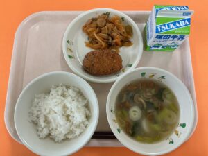 ・ごはん ・なめこのみそ汁 ・メンチカツ ・切り干しナポリタン ・牛乳