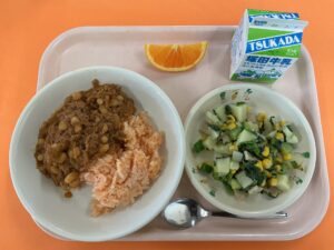 ・パプリカライス ・いんげんまめのチリソース ・ポパイサラダ ・国産オレンジ ・牛乳