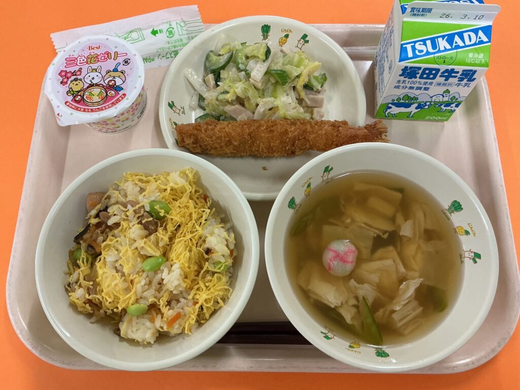 ・ひなちらし ・すましじる ・えびフライ ・桃色サラダ ・三色花ゼリー ・牛乳