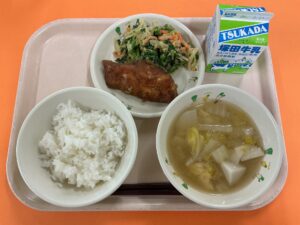 ・ごはん ・白菜と里芋のみそ汁 ・ますの竜田揚げおろしソース ・菜の花のごまあえ ・牛乳