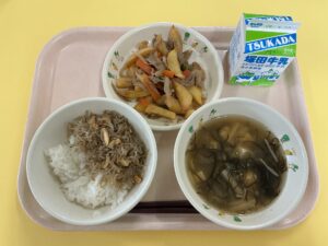 ・ごはん ・じゃがいものそぼろ煮 ・鉄火味噌 ・フルーツ漬け ・牛乳