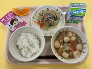 ・ご飯 ・ふりかけ(おかか) ・うずら卵入り豆腐の中華煮 ・中華サラダ ・国産オレンジ ・牛乳
