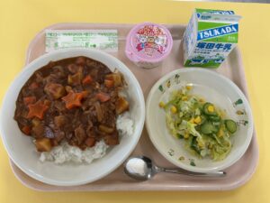 ・ご飯 ・ハヤシライスソース ・コーンサラダ ・お祝いいちごゼリー ・牛乳 今日は、1年生にとってはじめての給食でした。メニューはハヤシライス。子どもたちが少しでも楽し食べられるように、1年 …