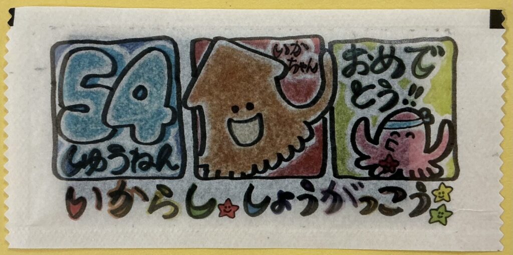 今日4月21日は、五十嵐小学校の54回目の創立記念日です。五十嵐小学校のお誕生日を給食でお祝いしました。味付けのりのパッケージデザインは、五十嵐小学校マスコットのイカちゃんのイラストと「54周年おめでとう」の文字が入っています。子どもたちが大好きな鶏肉の蜂蜜レモンソースと「祝」なると入りのさわにわんで、美味しく楽しくいただきました。かわいいのりのパッケージもとても好評でした。