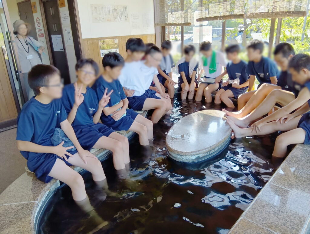 こちらも1年生の総合的な学習「岩室スコープ」。いわむろやへ情報収集(勉強)のために行ってきました。 ん?勉強? 足湯にも浸からせてもらって、なんだか楽しそう!
