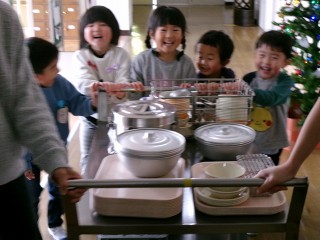 今日の給食はお星さまのかたちの煮込みハンバーグでした。みんなは今日もおいしそうに食べていました。給食後のみんなの様子をお伝えします。 給食後、いつもこうして給食室へ先生と一緒にワゴンを運びます …