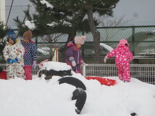 今シーズン一番の積雪。西幼稚園もあたり一面真っ白です。 みんなは早速外へ…。大きな雪だるまを作りました。 そして、みんながいく氷が張る場所に行ってみると・・・ …