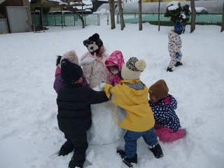 今シーズン一番の積雪。西幼稚園もあたり一面真っ白です。 みんなは早速外へ…。大きな雪だるまを作りました。 そして、みんながいく氷が張る場所に行ってみると・・・ …