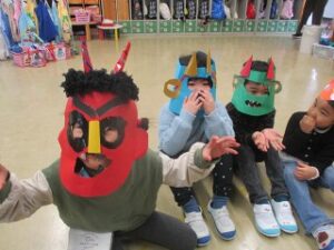 2月3日は節分。みんなで豆まきをしました。 その前に・・・・先生のお部屋に行ってびっくりさせよう~~~~! それでは、豆まき会をはじめよう!…としましたが、あれ?全員そろっていない …