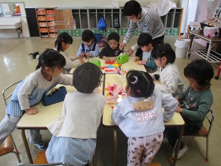今日は離任式の日。 登園した後、みんなでお世話になった先生に心を込めてお花を作りました。 そして、いよいよ離任式。 4名の先生が転出します。お世話になり …
