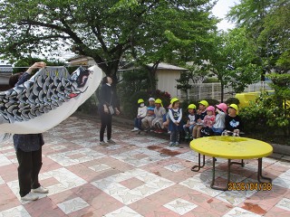さわやかな風がふく季節。野菜の苗に水やりをしたり、かわいい花を見つけたり、プールの足洗い場の水たまりにいるオタマジャクシを見たりしていると・・・・ 先生が「お友達連れてくるね」と言って、こいの …