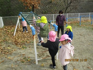 今日から12月。午前中、12月とは思えないポカポカ陽気。みんなは、おひさまのあたたかさを感じながら思い切り楽しんでいました。 玄関前では、集めておいた落ち葉が風でアッという間にちら …