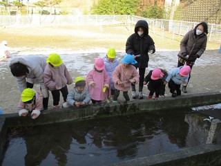 今日は、とても寒い日。外の様子はどうかな?とみんなで外へ行ってみると… わあ~!凍っている!… 氷の上って歩ける?!ちょっとあがってみたら、すぐに氷が割れちゃった!でもけっこう厚い氷でした …